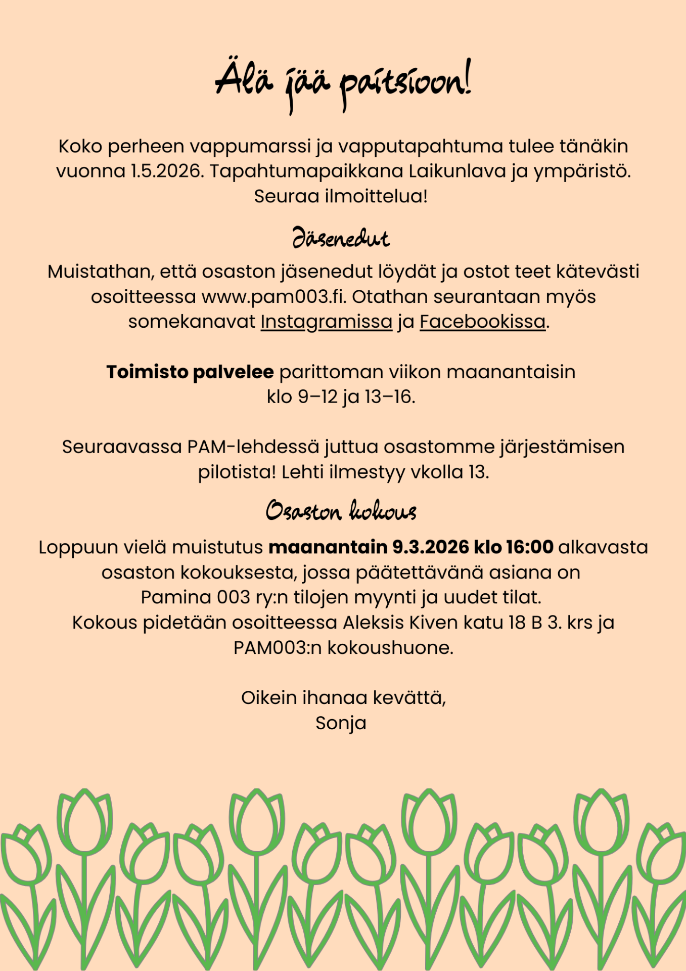 Johtokunta kokoontuu joka kuukauden toinen maanantai. Jos sinulla on terveisiä tai toiveita, olethan rohkeasti yhteydessä!