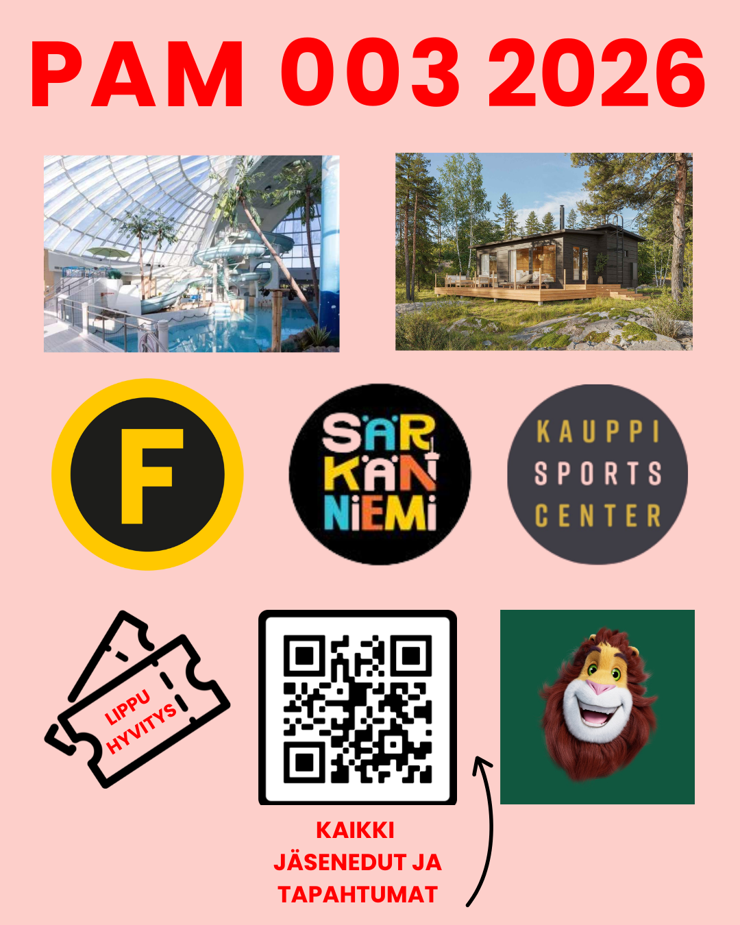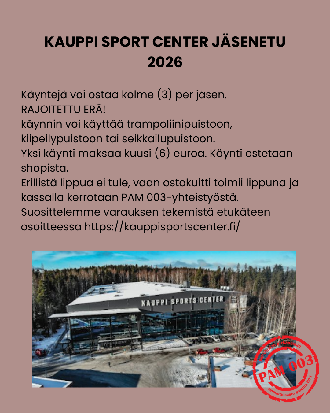JÄSENEDUT OVAT TARKOITETTU PAM 003:n MAKSAVILLE JÄSENILLE, POIS LUKIEN JÄSENMAKSUSTA VAPAUTETTUJEN LEFFALIPUT. TIEDUSTELUT ELÄKELÄISRYHMISTÄ JA EDUISTA toimisto@pam003.fi.