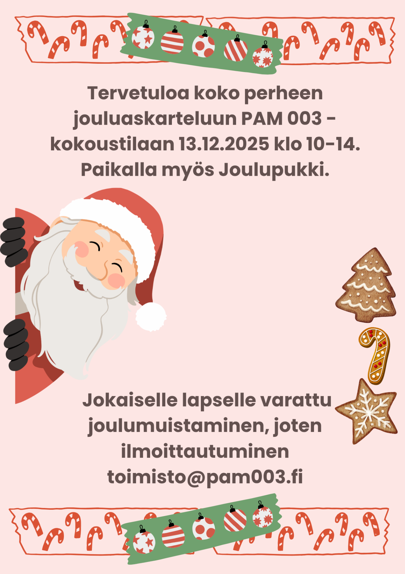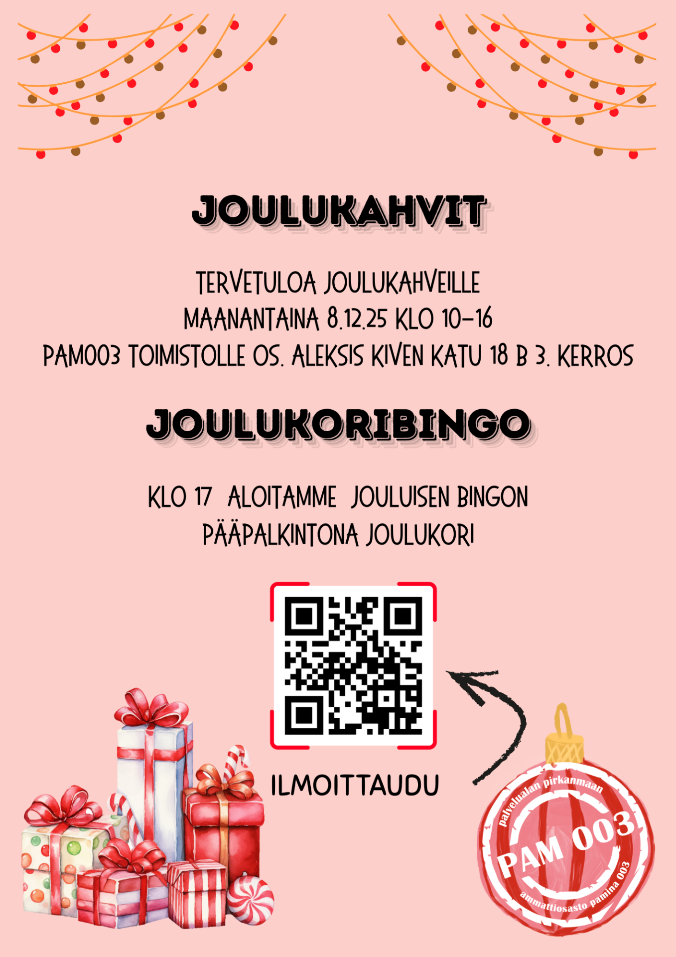 Joulukahvit yhdessä aluetoimiston kanssa 8.12.2025 maanantaina klo 10-16. Joulukoribingo klo 17:00 alkaen -> ilmoittautuminen bingoon toimisto@pam003.fi