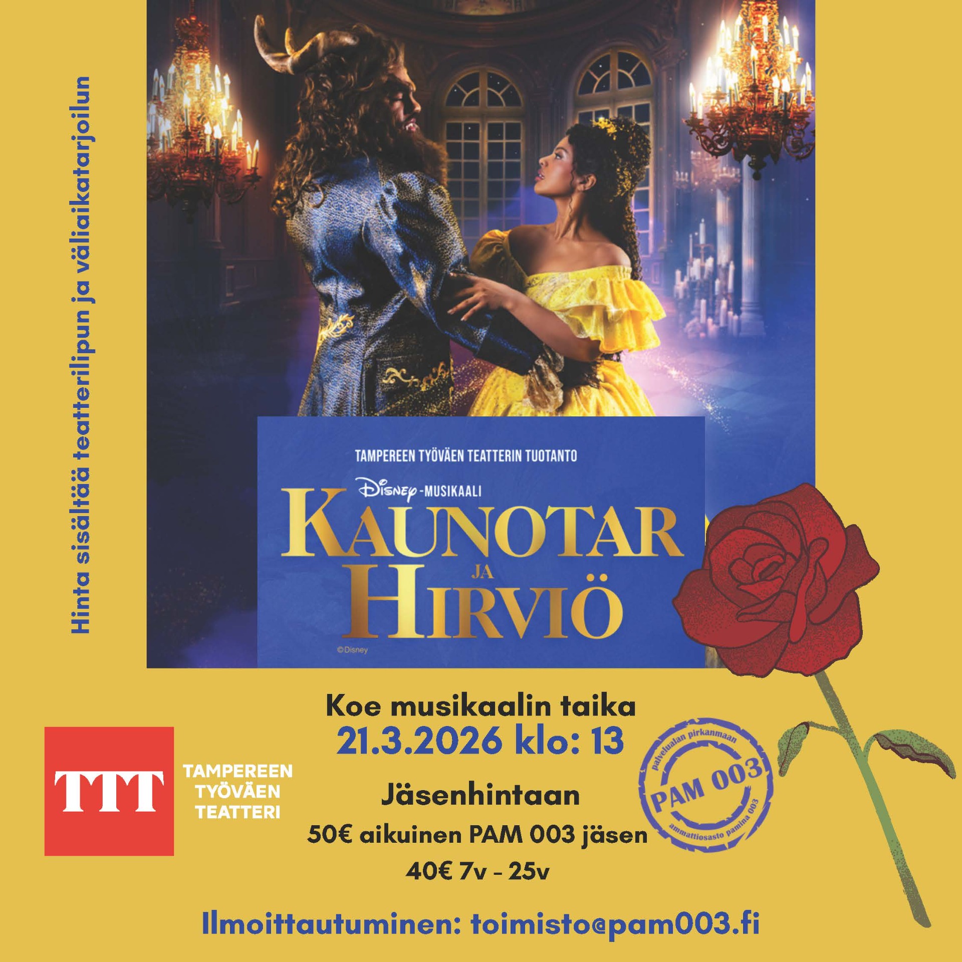 Paikkoja 30:lle ensimmäiselle. Omavastuuosuus 20€ sisältää teatterilipun ja väliaikatarjoilun (ennalta sovittu kahvi ja leivos). Ilmoittaudu toimiston sähköpostiin toimisto@pam003.fi.